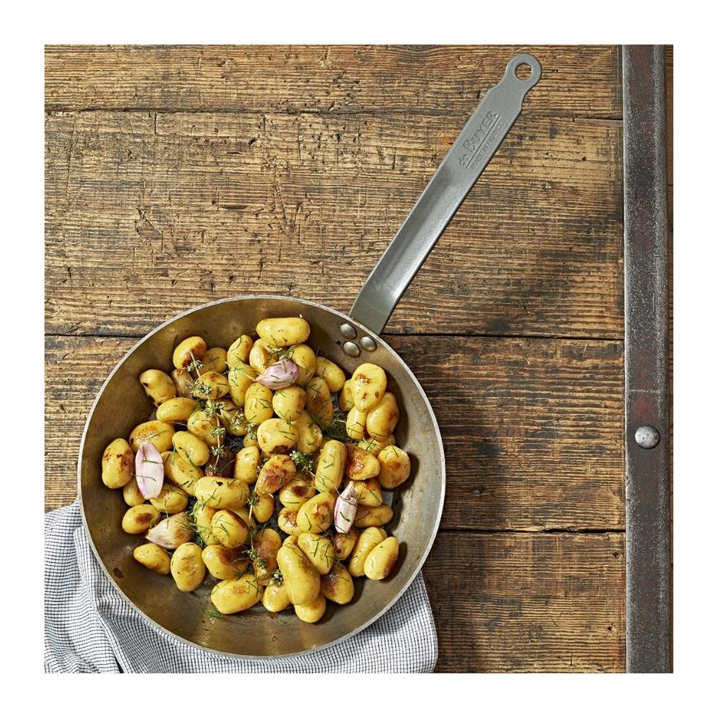 Frigideira redonda com borda alargada de aço inox, ideal para reduzir molhos graças ao seu formato que permite maior evaporação.