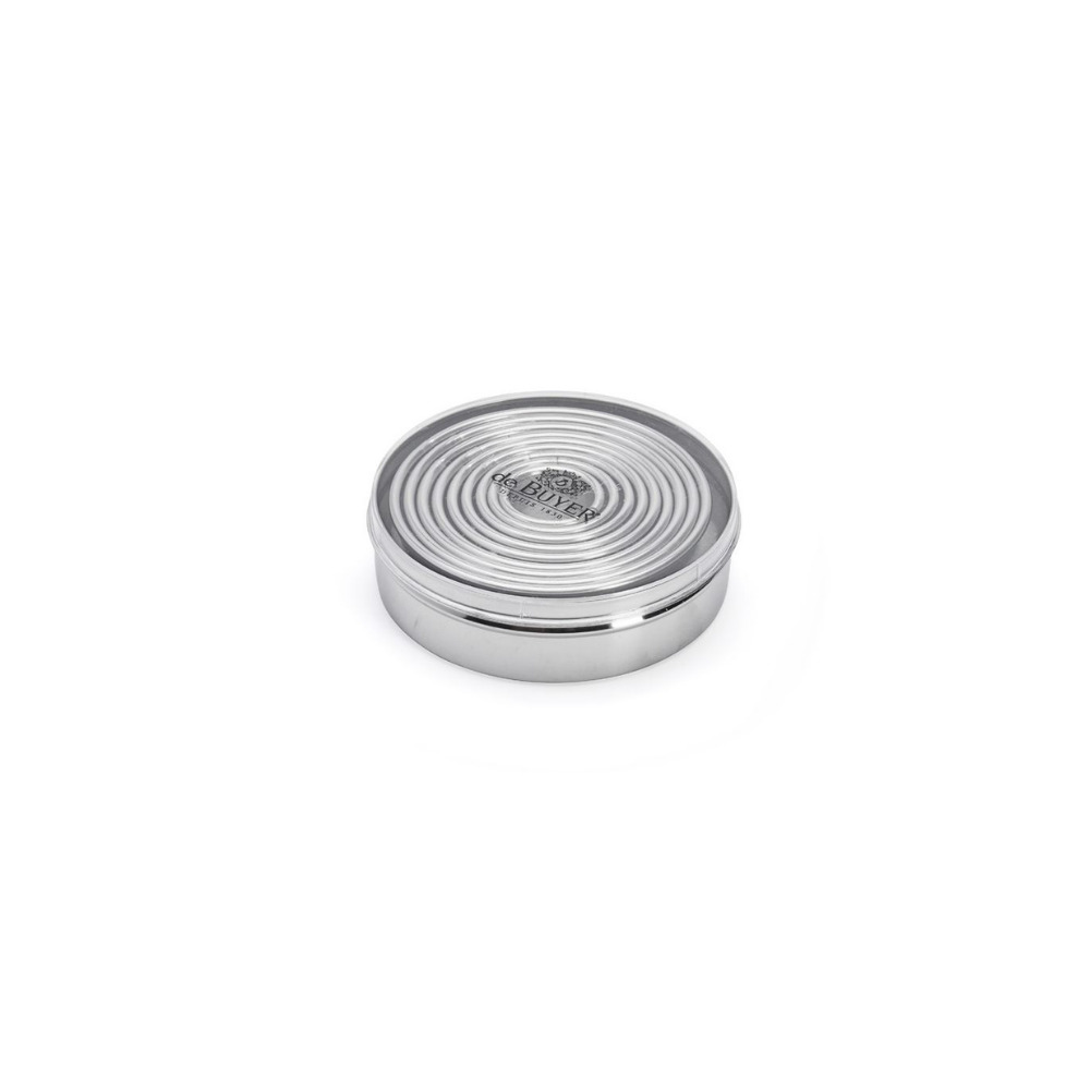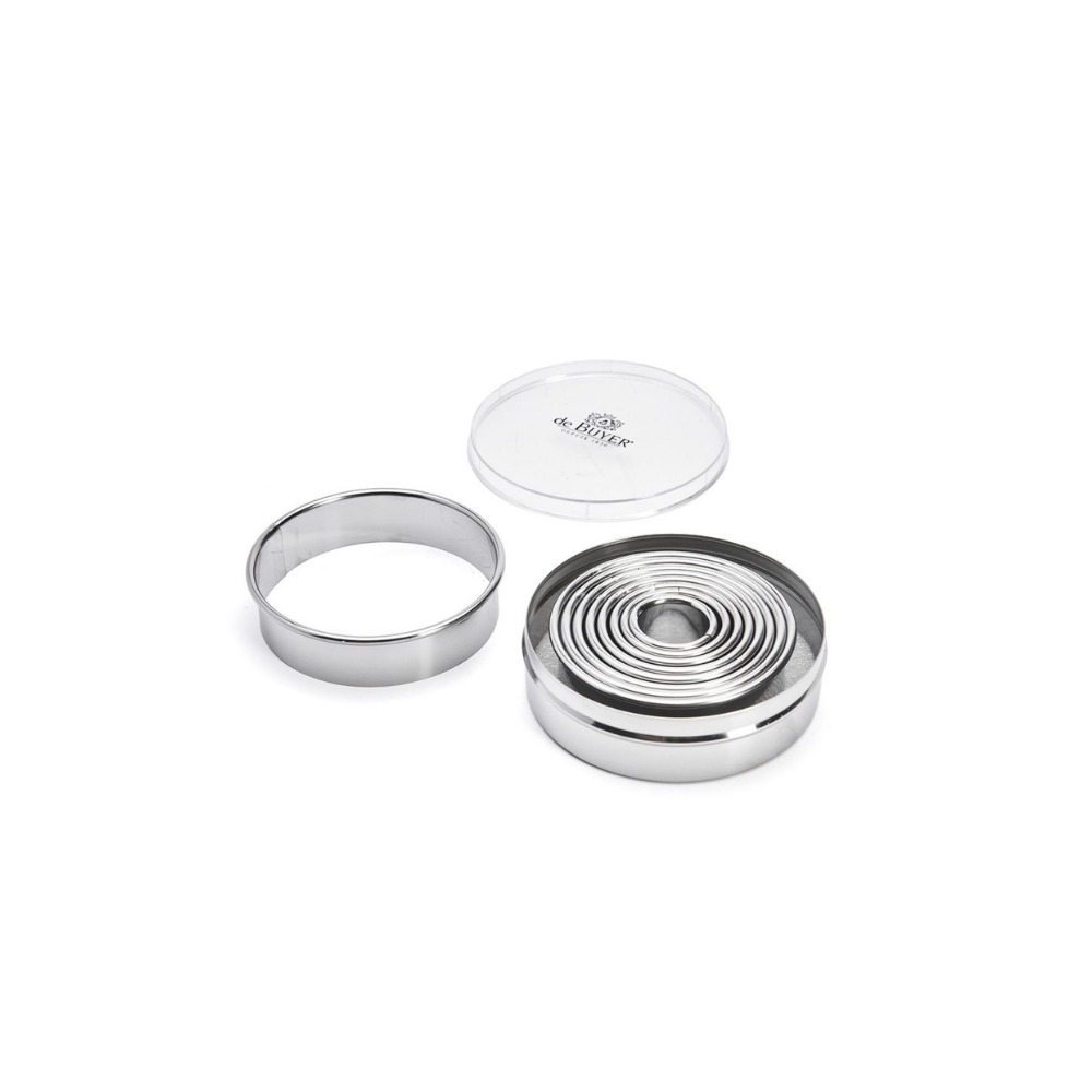 Esta caixa contém 9 cortadores de massa redondos e lisos, que permitem fazer bases de tartes para sobremesas ou decorações.